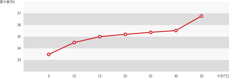 혼수량을 75%로 하고 수온을 5℃, 10℃, 15℃, 20℃, 25℃, 30℃, 35℃로 변화 시켰을 경우의 흡수율을 그림3과 같습니다.